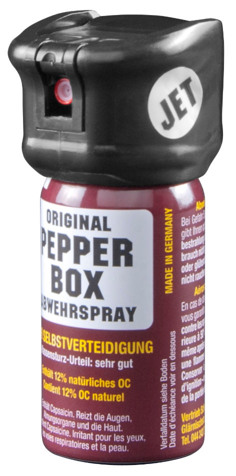 Der Pepper-Box Abwehrspray JET verfügt über einen Flüssigstrahl der über grosse Reichweite ein zielgenaues Sprühen möglich macht. Flüssigstrahl vernebelt nicht, daher bleibt er auch bei Wind eher stabil und erreicht sein Ziel.