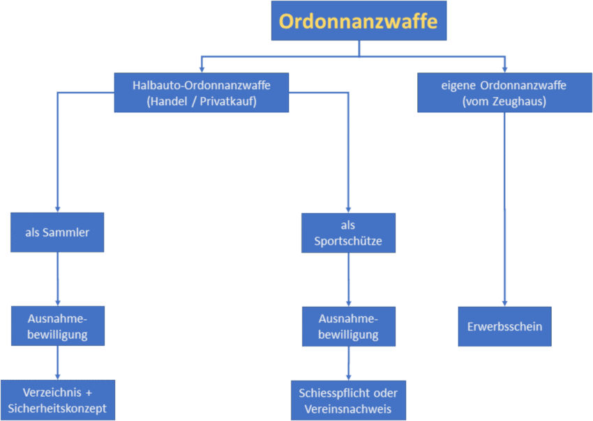 Unter Neuerwerb ist der Kauf einer halbautomatischen Ordonnanzwaffe im Waffenfachhandel oder von einer Privatperson gemeint. Wird die Waffe als gebrauchte, halbautomatische Ordonnanzwaffe im Waffenfachhandel oder von einer Privat-Person gekauft benötigt der Käufer mindestens eine Ausnahmebewilligung "klein" für Sportschützen. Wird die Waffe nach dem Ausscheiden aus dem aktiven Militärdienst direkt aus den Beständen der Militärverwaltung übernommen, so reicht ein Waffenerwerbsschein.
