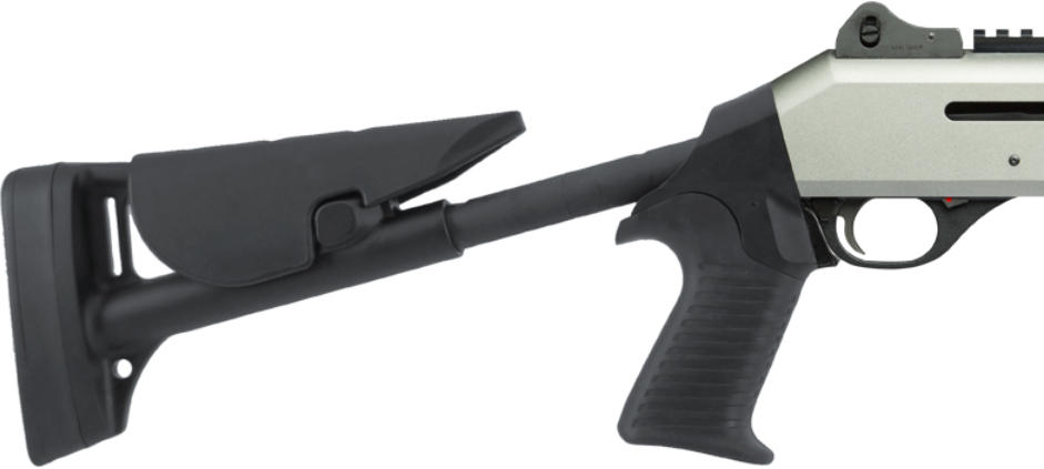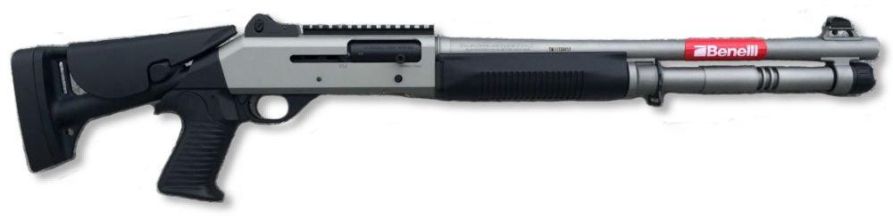 Halbautomat, Benelli, Modell M4 Super 90 Silver, Kal. 12/76, mit Auszugschaft, Ghost Sight, Picatinny Schiene und Pistolengriff