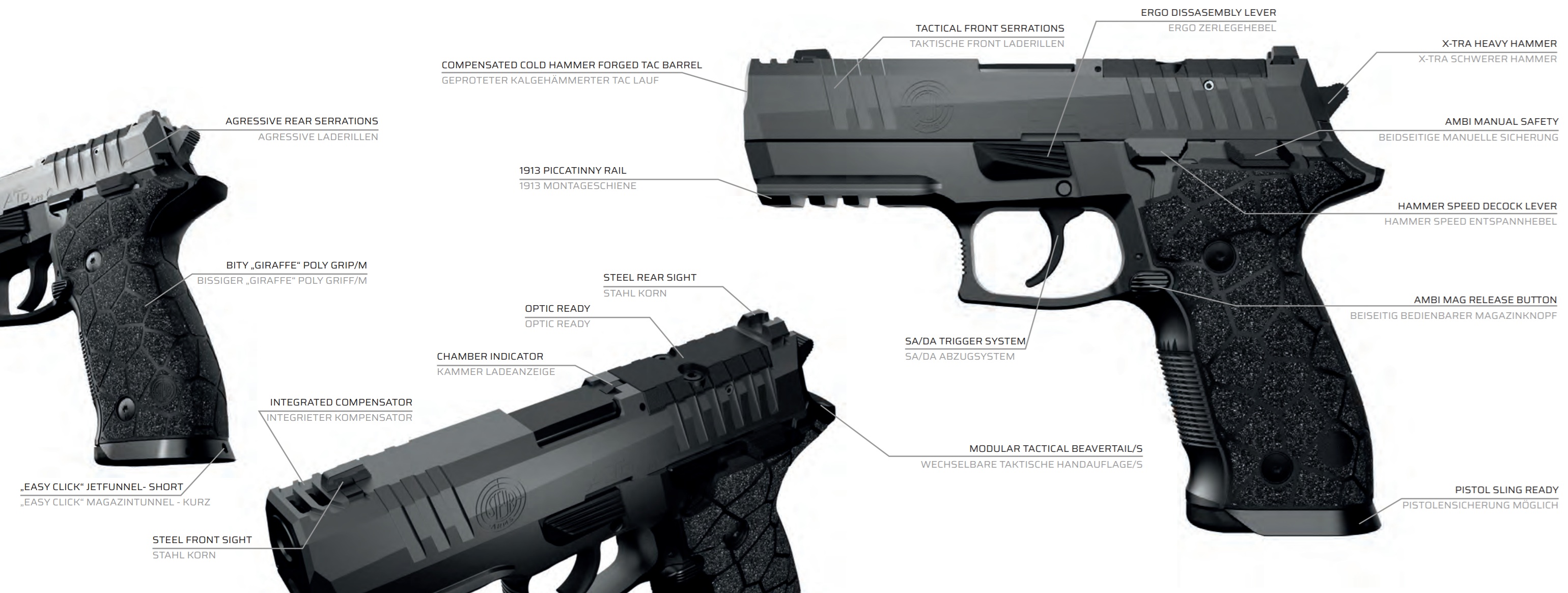 Im Selbstverteidigungsscenario, wo jeder Moment zählt und viel auf dem Spiel steht, erweist sich die ATD COMPACT COMP als sicherer Partner. Diese Pistole wurde sowohl für den kraftvollen Schuss, als auch für Präzision entwickelt und strahlt ein Gefühl von unerschütterlicher Zuverlässigkeit aus, was sie zu einer aussergewöhnlichen Wahl für das verdeckte Tragen macht. Ihr robustes und dennoch elegantes Design ermöglicht ein diskretes Tragen im Alltag und sorgt dafür, dass das Gewicht der Wa ff e kaum spürbar ist. Der integrierte Kompensator und der der geportete Lauf, garantieren auch in turbulenten Situationen eine ruhige Hand. Er reduziert den Rückstoss der Wa ff e spürbar und zuverlässig. Ausgestattet mit einem speziellen, sportlich abgestimmten SA/DA-Abzug liefert die ATd COMPACT COMP unvergleichliche Präzision, wenn es darauf ankommt. Ihre Kapazität von 18 Schuss bietet nicht nur Feuerkraft, sondern auch ein Gefühl der Sicherheit, um mit kontrollierter Präzision auf jede Bedrohung reagieren zu können. Die bemerkenswerte Balance und der ergonomische Gri ff der Wa ff e machen das Ziehen und Zielen intuitiv und ermöglichen es dem Benutzer, auch unter Druck mit ruhiger Hand die Situation zu beherrschen. Ausgestattet mit fortschrittlichen OR-Systemen erleichtert die ATD COMPACT COMP die schnelle Zielerfassung. Ihre Zuverlässigkeit in unterschiedlichen Umgebungen – ob Regen, Schlamm oder Hitze – sorgt dafür, dass sie im Ernstfall standhält. Die ATD COMPACT COMP nicht nur eine Pistole, sondern ein Beschützer, der dem Träger das Selbstvertrauen und die Fähigkeit gibt, sich gegen Unvorhersehbares zu behaupten und das zu schützen, was am wichtigsten ist.